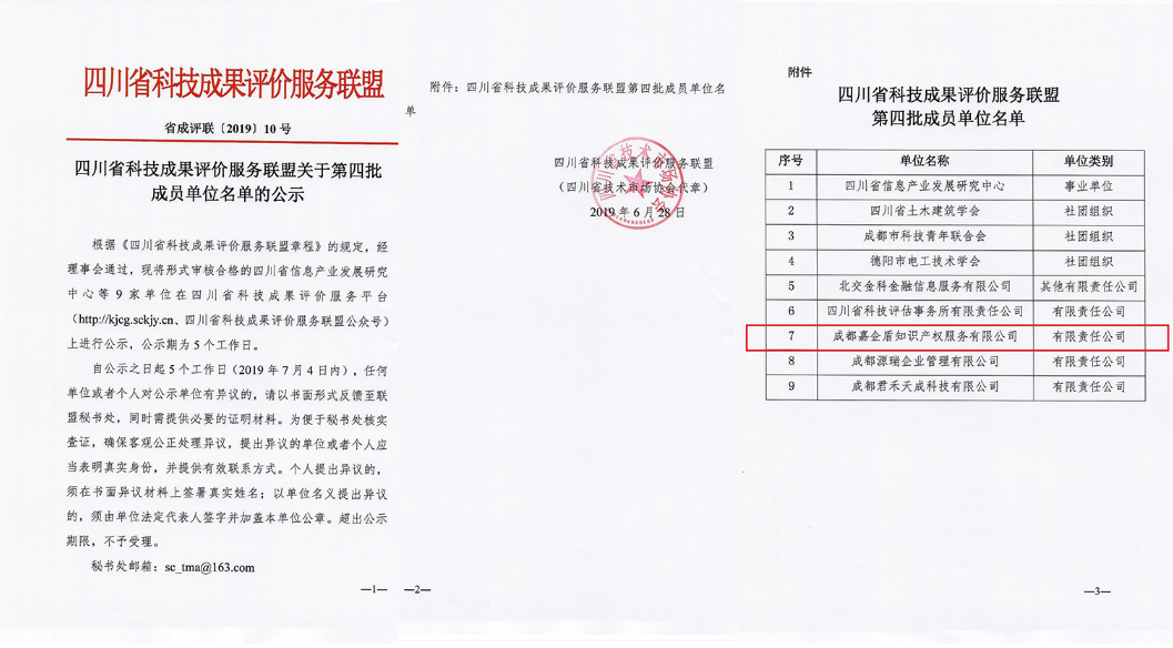 嘉企盾是四川省科技成果評(píng)價(jià)服務(wù)聯(lián)盟第四批成員單位。